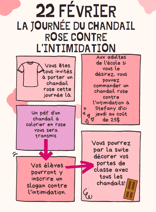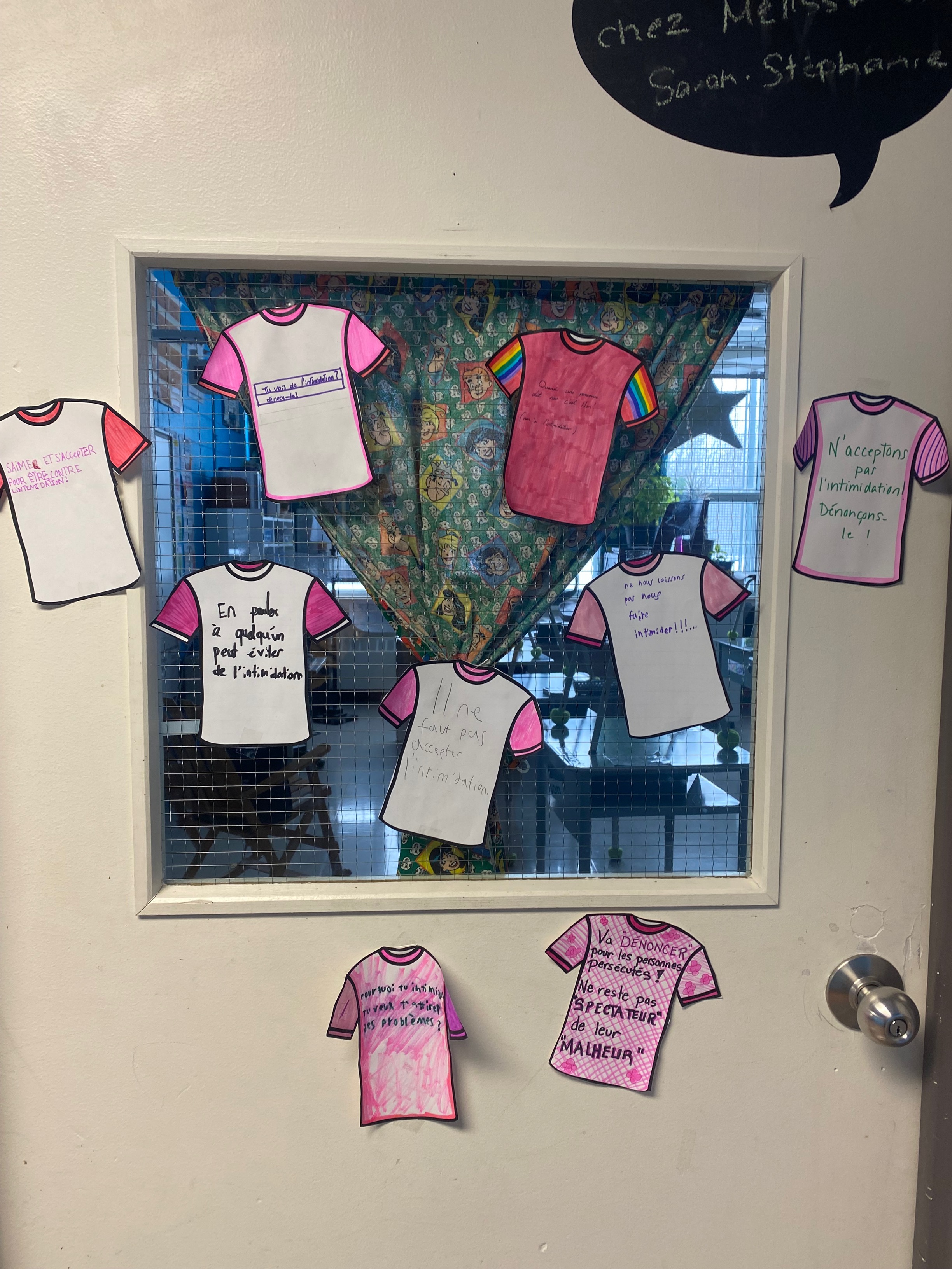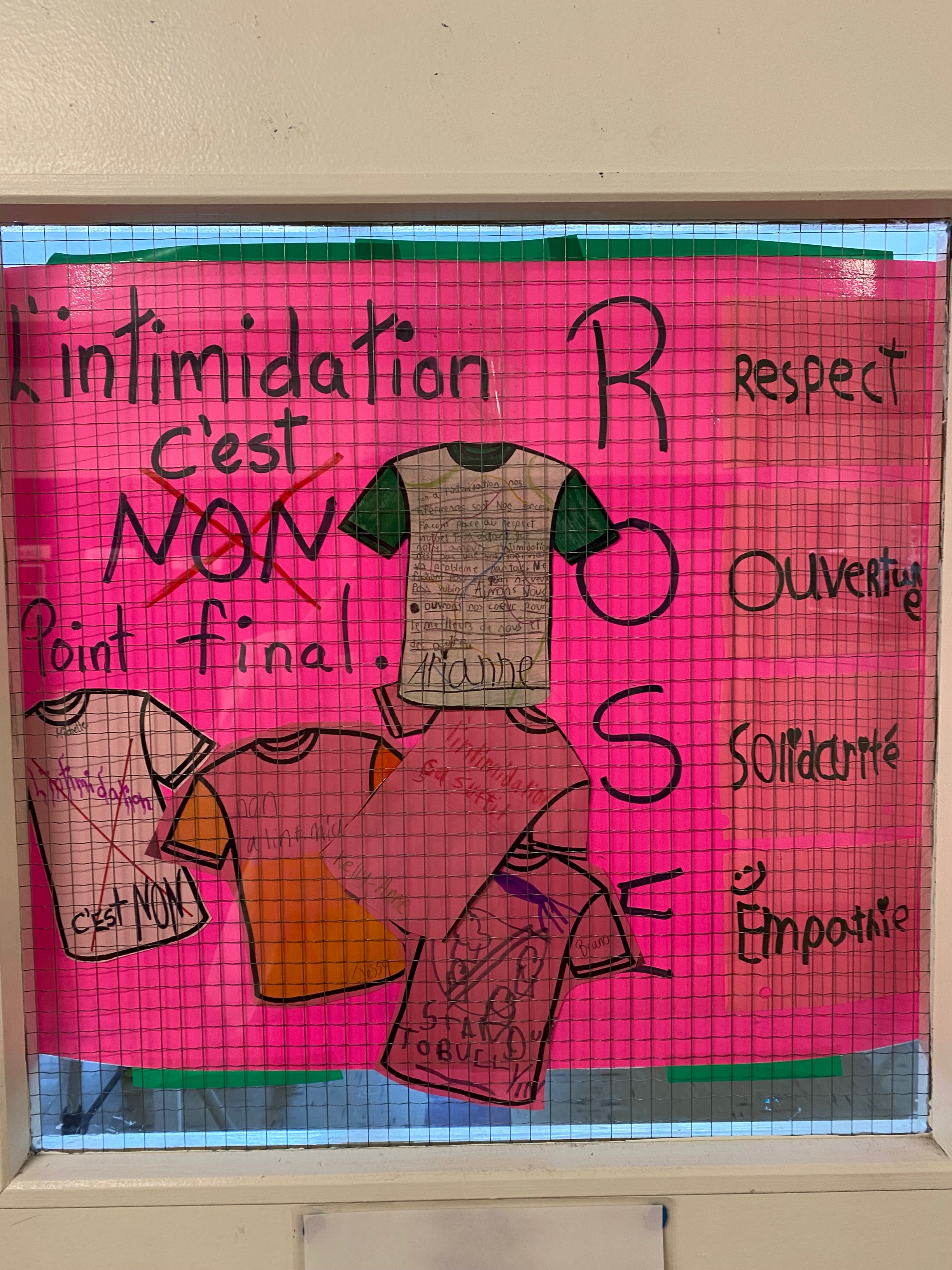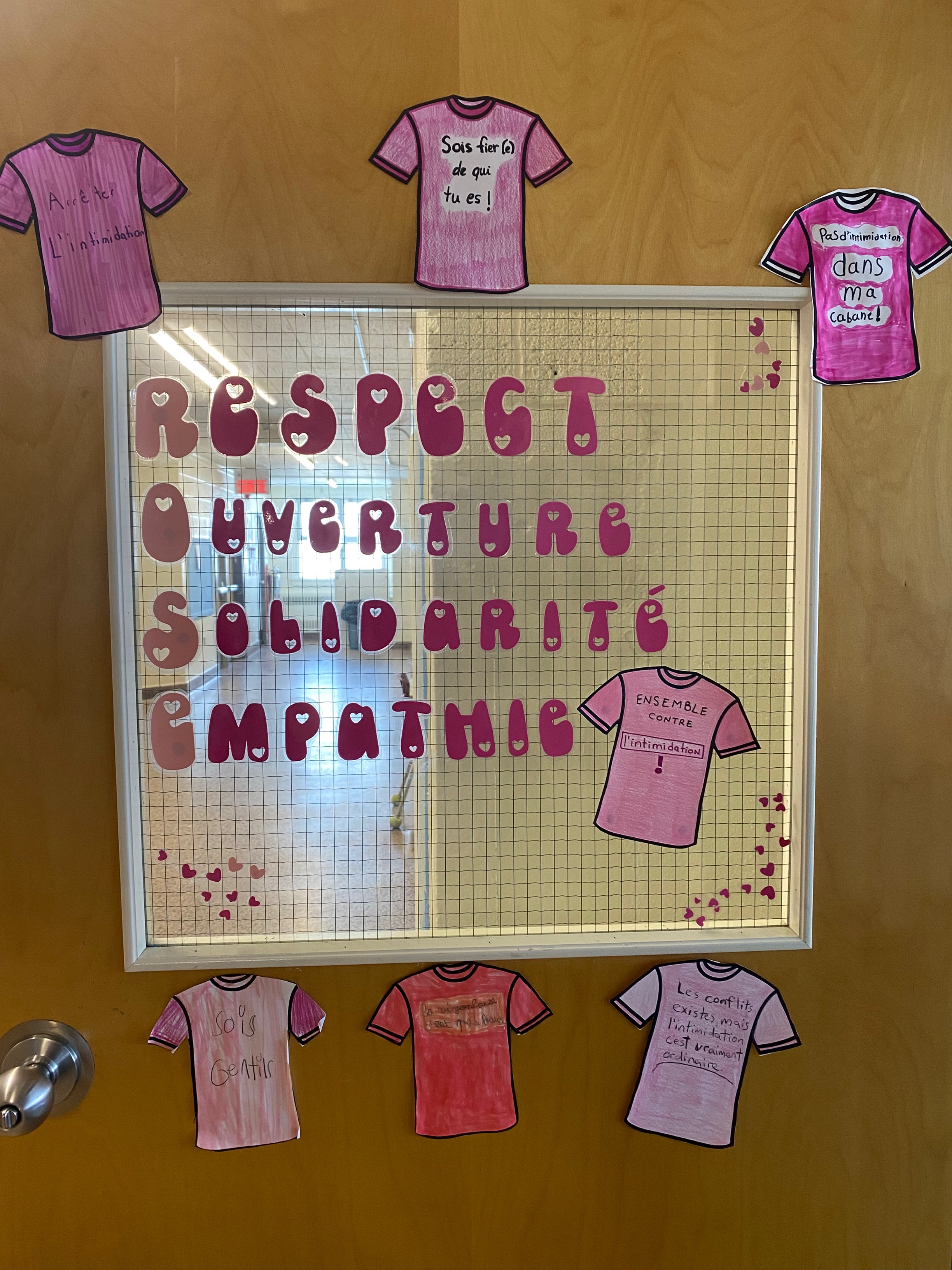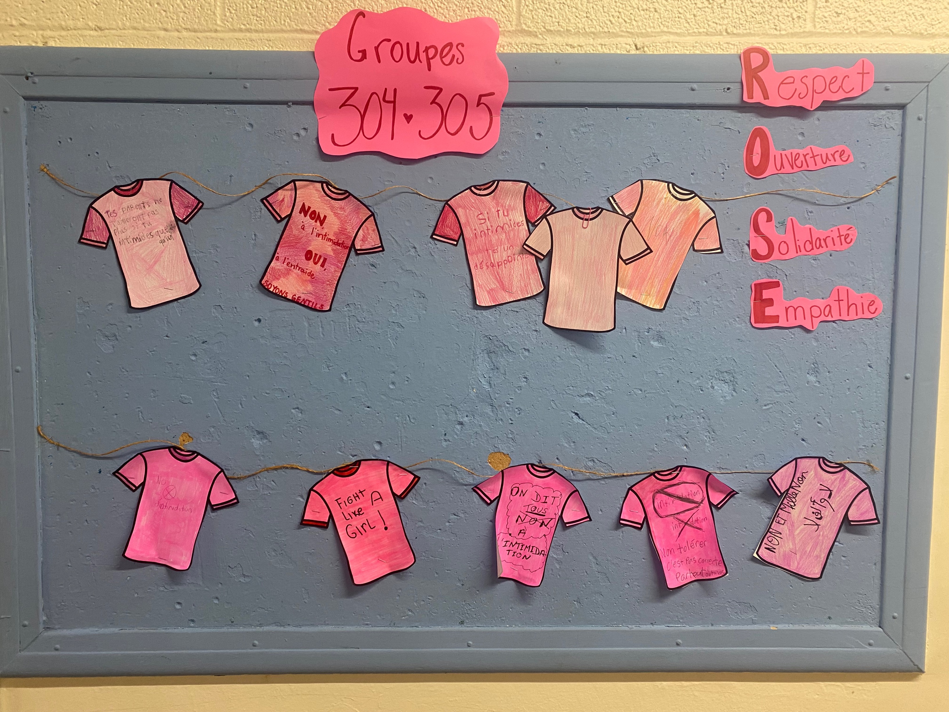 Afin de souligner cet événement, les élèves et tous les membres du personnel ont été invités à se revêtir de rose et afficher des messages contre l'intimidation dans le cadre d'une animation.