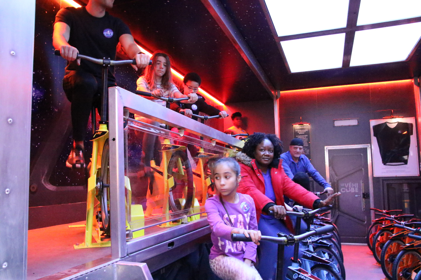 De passage dans le « Module d’entraînement », les jeunes ont l'occasion de pédaler en groupe dans un univers complètement éclaté.