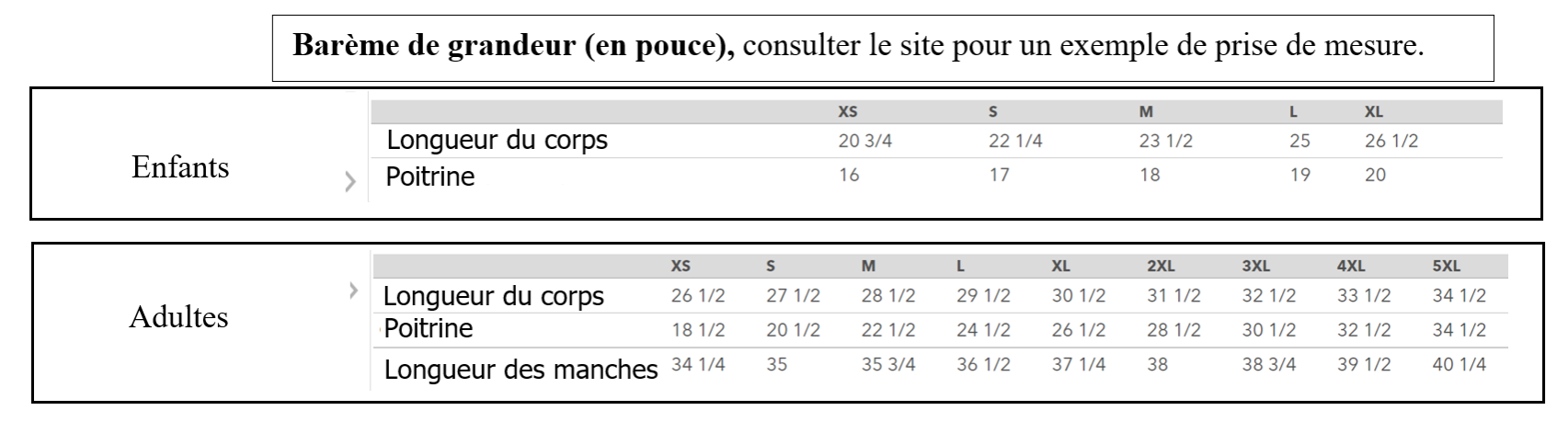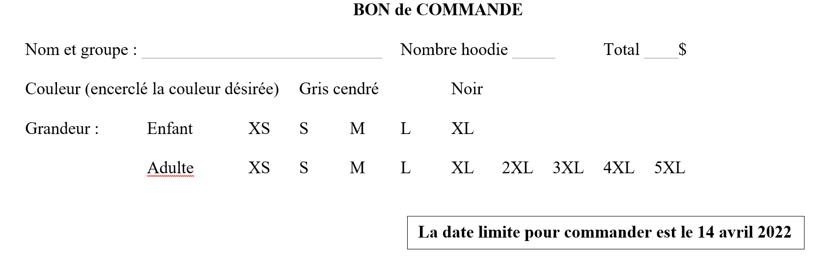Le hoodie se vend 15$ pour les élèves et 25$ pour les intervenants. Si un élève désire en avoir plus d’un, le deuxième et les autres se vendront 25$ chacun. Un barème de grandeurs (enfant et adulte) vous permettra de bien choisir la grandeur désirée. Car aucun échange et/ou remboursement sera fait une fois la commande effectuée.