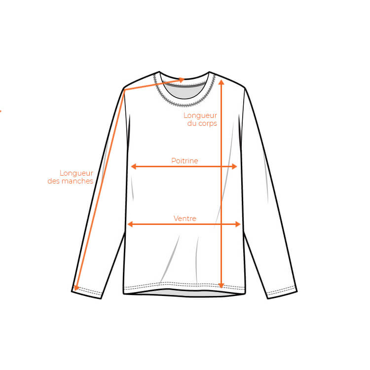Comment prendre les mesures. Vous pouvez les prendre sur un chandail que vous avez en votre possession. Ils doivent être prises à plat. Pour la poitrine, ce n'est pas le contour de votre poitrine mais la longueur du devant du vêtement.